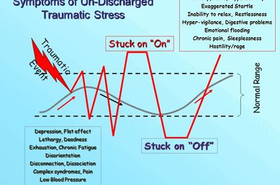 This simple image (on right above) provided by the Somatic Experience Training Institute, shows a window with two lines between which is our nervous system function. The normal range between the dotted line is called our social engagement system (or the functional range of our regulated nervous system), our energy rises and falls naturally related to when we need mobilize and when we need to rest. In this range we feel balanced, appropriately reactive, curious, able to sleep, eat and rest. When we get overwhelmed, we either go above the line beyond where we can cope or below it. When we go above the range, we speed up and become irritated, annoyed, angry, upset, sometimes rageful. We want to fight or flee. If we drop below the range we dissociate, numb out, freeze or collapse. Here is another map.